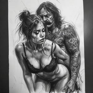 Hij opende zijn leren broek en liet het op de grond vallen. Hij droeg geen ondergoed en een massieve penis stond paraat naar boven gericht. Gedragen door gespierde billen leek hij duidelijk tijd te hebben doorgebracht in de gym. Laura keek als gehypnotiseerd naar de naakte macho en aarzelde.