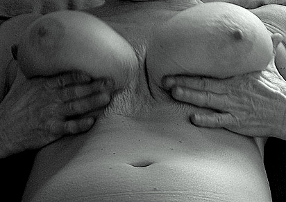 'Tot zo ver gaat alles goed, Stef. Je mag best kijken, hoor. Dat is de bedoeling, dat snap je toch wel?' Ze keert zich met een kwartslag naar me toe zodat ik niet anders kan dan haar borsten zien. De eerste van mijn leven! En dan nog die van mijn oma! En wat zijn ze ontieglijk mooi. Er lopen massa's rimpeltjes vanaf de aanzet van elke tiet naar de grote bruine vlek in het midden. Haar borsten hangen, zodat ik de tepels niet kan zien. Ze neemt beide borsten in haar handen, alsof ze ze weegt. Nu zie ik de iets lichter gekleurde tepels, stevig, vlezig, veel dikker dan ik me ze had kunnen voorstellen, en schaamteloos naar me toe wijzend.
