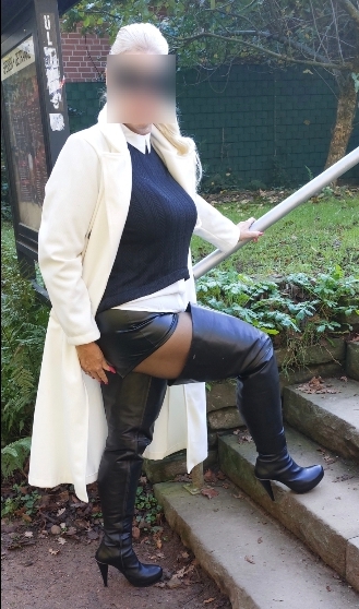 Bij het uitstappen valt haar lange witte mantel mooi over haar lange sexy benen gehuld in nylons en de lange zwarte dijhoge laarzen.