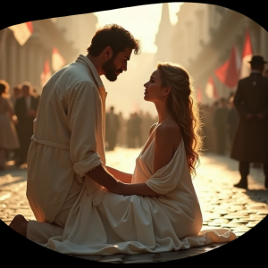 Met haar nieuwe, improviseren outfit sloeg ze een willekeurige straat in, hopend dat ze niet al te veel zou opvallen. Maar natuurlijk, het lot had andere plannen. Ze botste tegen een straatverkoper die een kar vol groenten duwde. "Kijk uit, slet!" riep hij, terwijl een regen van wortels en uien over de grond rolde. Lisa kromp ineen, haar wangen gloeiden van schaamte. "Sorry, sorry!" stamelde ze, terwijl ze een wortel van de grond pakte en hem teruggooide. De verkoper keek haar boos aan, maar toen hij haar laken zag, schudde hij zijn hoofd en liep verder.