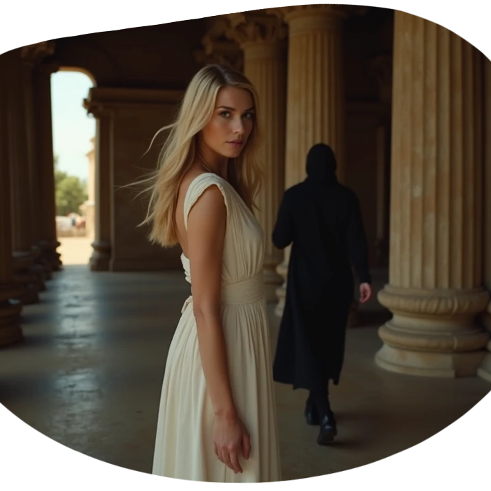 Ze benaderde hem langzaam, haar heupen wiegden zachtjes met elke stap. “Keizer Caesar,” fluisterde ze, haar stem zacht en verleidelijk.