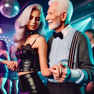Plots hoorde ik een hoog stemmetje achter me. “Hee Char, gaat ie lekker met die ouwe?" Vroeg ze. Ik keek om en daar stond een heel leuk meisje, bruin haar, donkere ogen. “Oh Merel, het is goddelijk. Dit is mijn opa, opa, dit is Merel mijn beste vriendin, natuurlijk niet mijn echte opa, hij kan neuken als de beste, het is de leukste opa die je krijgen kunt.” “Dat wil ik wel eens testen.” zei Merel. Tot mijn stomme verbazing zei Charlie: "Oké, je mag hem een half uurtje lenen, dan kan ik die drankjes op de bar nog even leegdrinken en kun je me daarna vertellen hoe lekker hij kan palen." Ze droeg als het ware mijn lul over aan haar en beende naar de bar. Ik had nauwelijks tijd om wat te zeggen want Merel had me al vastgepakt, drukte haar lippen op de mijne en meteen stak ze mijn lid in haar sleuf. “Oh ja, dat voelt echt lekker, die pik van jou.” Zei ze en kwam al snel klaar want ik voelde een warme straal tegen mijn buik spuiten terwijl ze verkrampte. Ze had een wijde crop top aan waardoor haar memmen aan de onderkant onbedekt waren. Ik maakte hier natuurlijk gebruik van en mijn hand kon heerlijk, daaronder, haar opgezette tepeltjes masseren. Plots fluisterde ze dat ze hem ook wel eens in haar kontje wilde, ik wist niet wat ik hoorde. Ze draaide zich om en tilde haar rokje van achteren omhoog. Doordat ze korte laarsjes, met net zo hoge stiletto’s als die van Charlie droeg, kwam haar sterretje op precies de goede hoogte. Ik schoof hem er heel gemakkelijk in omdat ze even tevoren had gespoten en alles mooi gesmeerd was . Het viel me op met wat voor gemak die jonge meiden anale sex konden bedrijven. Ik zat er helemaal in, ze begon hem met haar sluitspier te melken. Met een hand vingerde ik haar van voren en met de andere had ik een borst vast. Af en toe draaide ze haar hoofd naar me toe om me te kussen en aan haar gezicht zag ik dat ze ervan genoot. Even later kreeg ze weer een orgasme en droop het vocht over mijn vingerende hand. Ik probeerde wat op te vangen en bracht het in mijn mond. Ik kreeg veel waarderende blikken van de om ons heen dansende paren. Hierdoor begon er toch nog wat te borrelen en dat voelde Merel ook. Ze draaide zich snel om, om mijn melk te drinken. Het was niet veel want ik had nog nooit zoveel seks gehad als dit etmaal en was ook nooit zo vaak klaar gekomen. het was genoeg om in haar mondje en over haar gezicht te lozen. De mensen om ons heen vonden dat blijkbaar spectaculair en begonnen spontaan te applaudisseren.