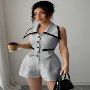 Mooie wijde licht grijze korte broek, wat iets weg heeft van een rokje. Met hierop een getailleerd jasje zonder mouwen maar met een opvallend grote kraag in de zelfde kleur maar afgezet met een zwarte brede bies deze bies accentueert ook de zakken, met vier grote zwarte knopen. Het is een soort bewerkte stof met iets wat op een ruitje lijkt. Zwarte pumps, zwarte accessoires zoals een ketting, armbandjes en grote oorbellen haar haren in een grote grove staart, plukjes haar langs haar gezicht en subtiel opgemaakt maar met opvallend rode lippen en nagellak.