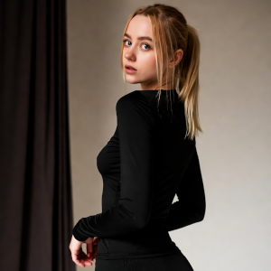 Het gangetje naar de gymzaal is halfduister en ik loop vlak achter haar. Opeens stopt ze en ik bots bijna tegen haar aan. Ik vang mezelf op door mijn hand in haar taille te drukken.