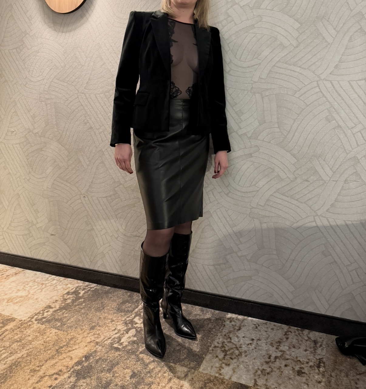 1 drankje werd een 2e drankje en toen zag ik plots iets fantastisch in mijn ooghoek. Daar kwam de vrouw aanlopen van wie ik al 25 jaar hou, de vrouw waarvan ik al 25 hard kan worden, maar nu zag ze er ongekend vrouwelijk, sexy en krachtig uit. Dit was mijn droombeeld van hoe mijn vrouw eruit kan zien. Dit was echt ongekend. Daar liep ze op mooie zwart glimmende laarzen, haar benen gehuld in heerlijk nylon met een naad op de achterzijde, een leren rok, een blazer, maar vooral wat eronder de blazer zat. Ze droeg een heerlijke body die te contouren van haar borsten zichtbaar maakte. Je zag de mooie ronde vormen en als je goed keek zag je zelfs haar tepel er ligt doorheen. Dit was geen vrouw die niet wist wat seksualiteit is en hoe dat te spelen. Dit was een vrouw die exact wist hoe je dit spel speelde! We gingen op pad richting het restaurant en bij het betreden van de zaak moest je enkele traptreden op. Ik laat haar voor me lopen, zodoende had ik een pracht uitzicht op haar kont, nylon benen en laarzen. Bij het traplopen zag ik in de spilt de rand van haar kousen. Man wat kick ik daarop! Samen genoten we van meerdere gangen vol met lekker eten. Tussentijds moest ik echt hoognodig richting het toilet. Bij terugkomst viel me op dat mijn vrouw wat was gaan verzitten. Ze was dusdanig gaan zitten dat haar benen zichtbaarder waren dan eerst, maar wat vooral zichtbaar was geworden was haar kousenrand. Met een geile en speelse blik keek ze me aan, ze was me echt aan het uitdagen. Ik ging naast haar zitten en zei hoe fantastisch dat beeld was. Mijn hond laat ik op haar rok rusten en voel dat door de stof dat ze niet alleen kousen draagt, maar ook nog eens jarretels! Voor mij toch 1 van die ultieme symbolen van sexy zijn! Ze zei dat ze nog 2 verrassingen voor me had. Ze legde iets in mijn hand en zei dat ze het warm had gekregen. Ik keek en zag haar stringetje in mijn hand liggen. Die had ze klaarblijkelijk hier onder de tafel weten uit te trekken. Wow ik stond knetterhard en de eerste druppels voorvocht lekten al. Wat was verrassing 2 dan? Ze zei dat een andere wens van mij is uitgekomen, haar sexy gedrag was gezien door een andere bezoeker van het restaurant. Hoe dan? Hij had zitten kijken terwijl ze wat rommelde om haar ondergoed uit te krijgen en dat ze bewust daarna zo is gaan zitten om hem een blik op de kousen te geven. Ze wist zeker dat die man daarvan hard moet zijn geworden, ik in elk geval!