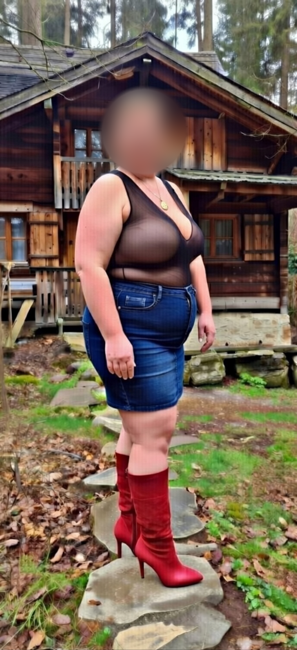 We hebben eerst alles uitgeladen. Daan maakte nog een foto van mij voor het huisje. Daarna vuur gemaakt. Ik had een strak spijker rokje aan en een zwart doorschijnende shirtje en rode laarzen , niets eronder. Niet omdat ik meteen iets wilde uitlokken…maar mijn kleding zei genoeg gewoon omdat ik wist dat zij het zouden zien. En waarderen.