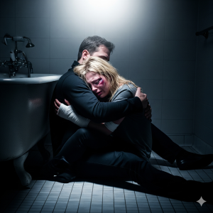 We zitten daar uren, zo lijkt het. Op de harde, koude vloer van de badkamer, onder het genadeloze witte licht dat geen enkele schaduw toestaat, in de zure stank van mijn eigen falen. Hij, de stille wachter. En ik, het gebroken ding in zijn armen dat langzaam, heel langzaam, stopt met schudden en zich overgeeft aan de zwaartekracht van zijn greep.