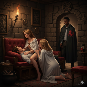 Terwijl de geur van zweet en lust nog in mijn neus hing, liep ik naar het buffet. Mijn lichaam trilde nog na van de ontladingen met Kim, Irmalia en Celeste. Ik pakte een bord met wat wildbraad en een groot glas dieprode wijn om mijn krachten te herstellen. Terwijl ik daar stond te eten, viel mijn oog op een bekend silhouet in de schaduw van een zijbeuk.