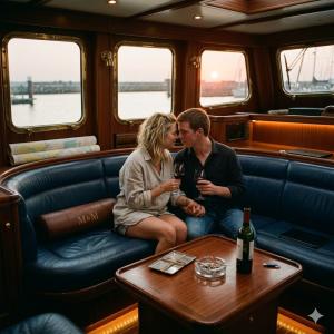Ik deed alsof mijn hart niet bijna uit mijn borstkas sprong door de USB-stick die tegen mijn dij drukte. We liepen naar het achterdek, waar de luxe echt decadent werd. De loungehoek was bekleed met wit maritiem leer dat oplichtte in de dieprode gloed van de ondergaande zon. De jacuzzi dampte zachtjes, een uitnodigende oase op het glimmende teakhout.