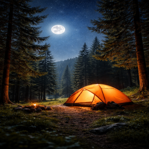 Het was nog benauwend warm in het tentje, het zonnetje had niet lang nodig gehad om te temperatuur te doen oplopen. Het schijnsel van de volle maan drong gemakkleijk tussen de bomen door en verlichtte het binnenste van de tent met een oranje achtige gloed.